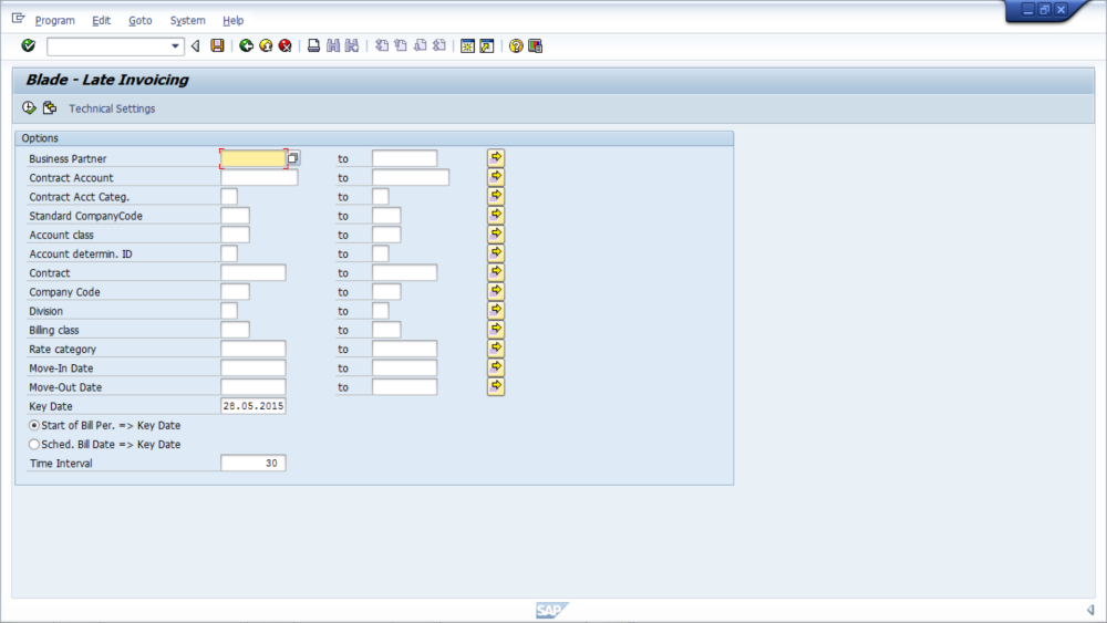 e.g. If you want the Late Invoice position up to the end of Quarter 2, this might be set to 06.30.2015 (American) 30.06.2015 (Europe). The report will calculate the number of late invoicing days up to and including this date. It is recommended this is set to today’s date to allow any management decisions to be made with the current late invoicing position. Any accounts that have not been invoiced after the key date will not be displayed in the report.Start of Bill Per. => Key Date: The ‘‘Start of the Billing Period’‘ is day +1 from the last invoice with a successful print date. Selecting this option will mean the late invoicing days will count will commence from this date.