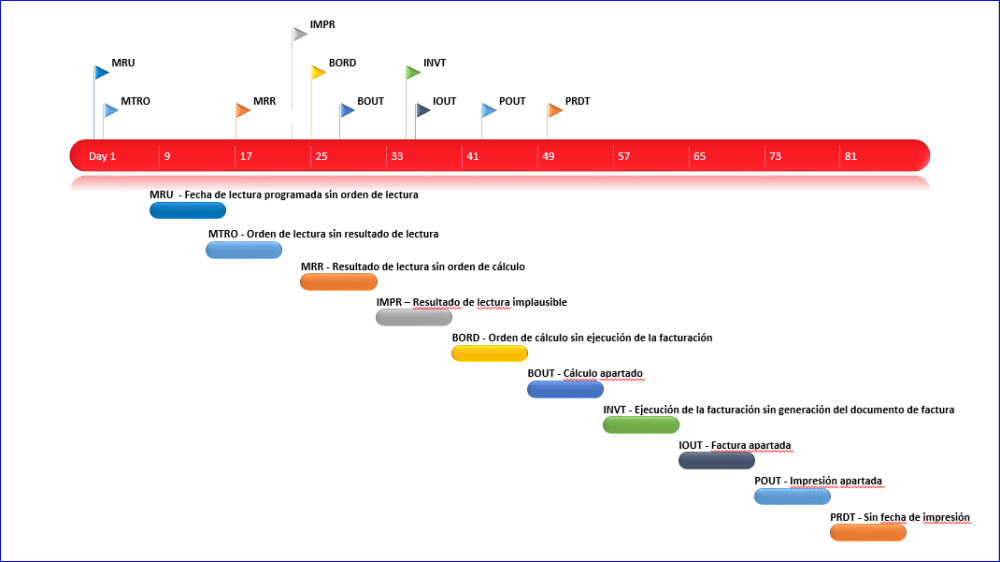 (La línea de tiempo que se muestra en días a continuación es a modo de ejemplo, ya que la línea de tiempo del Proceso de Facturación SAP puede configurarse a medida para su empresa).