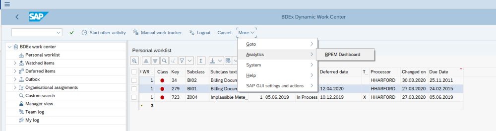 Go to the top menu option and select More->Analytics->BPEM Dashboard