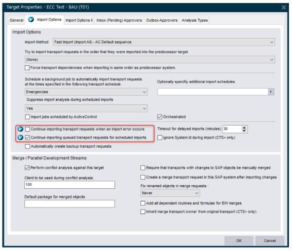 Given Outbound integration is triggered by transports being imported into a system and landing in the Test Queue, it is advisable to DISABLE the following target configuration option