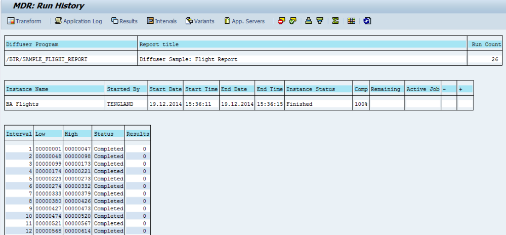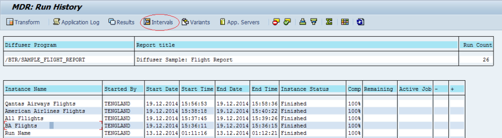 By drilling down on the program name the user will access the programs instance runs. Select an instance and click “Intervals” to display the intervals to that specific instance run.
