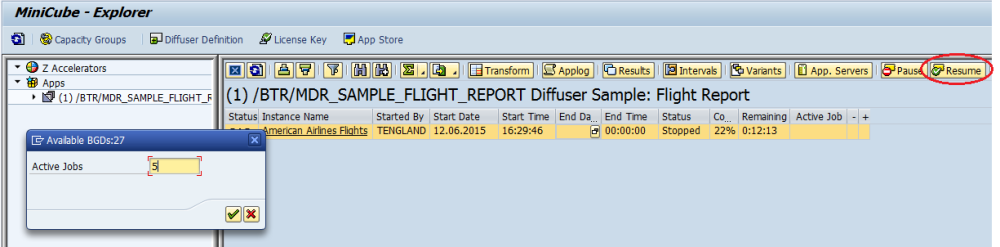 To resume a program select the instance and press the resume button, a pop appears for the number of jobs required to start processing intervals.