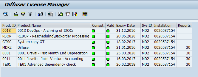 The keys installed are shown as below. Note that any red status icons indicate a problem with the key details being consistent with the system or being out of validity.