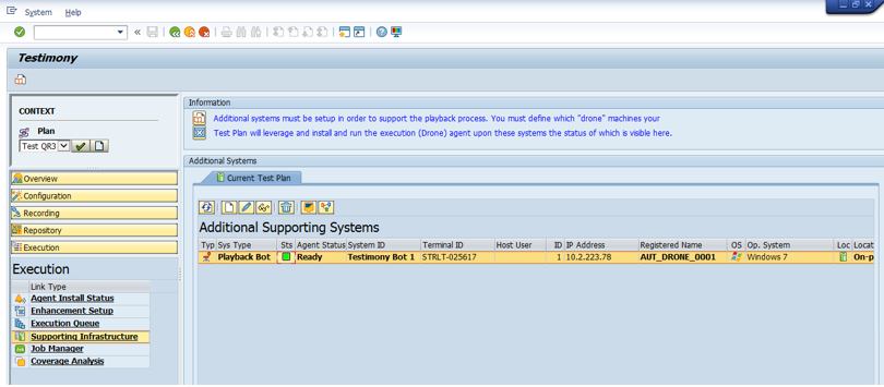 2)Execute Testimony transaction /N/BTI/AUT in SAP GUI. Navigate to the ‘Execution’ tray and select ‘Supporting Infrastructure’ and the Bot should have a status of ‘Ready’