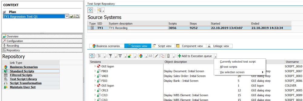 - Click on “Transfer to Execution Queue”. If you’ve filtered the scripts when you transfered them to the repository, you can select all scripts. Otherwise you may want to narrow your selection via Selection screen