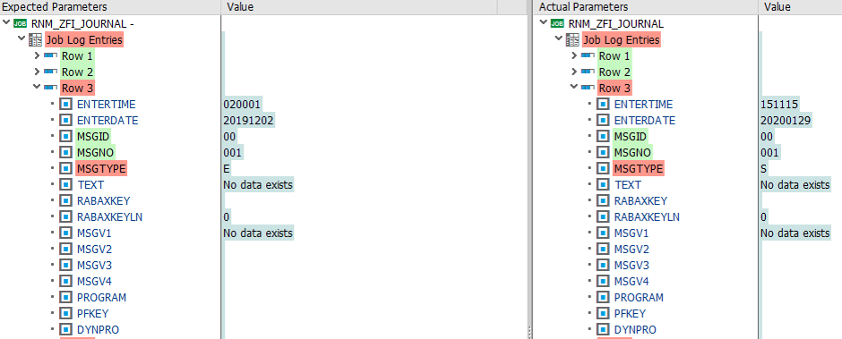 Here it seems that the only difference is that the MSGTYPE has changed from an E in the recording to an S in the playback. MSGTYPE denotes the severity of a message, and batch jobs will terminate if they encounter a message with MSGTYPE=E (unless the message is otherwise handled in the code). We can also see that the message text “No data exists” is the same in both the recording and the playback.