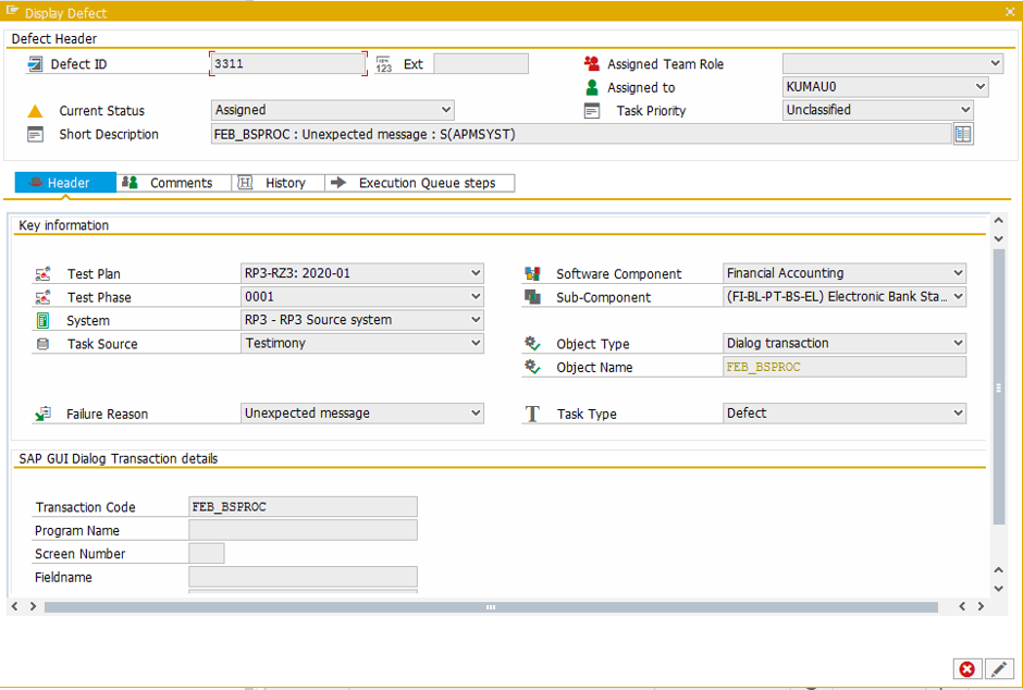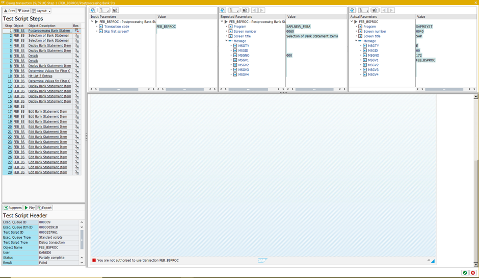 This is another example of Testimony highlighting exactly the type of change in behaviour that you want to test for in a regression test. Since Testimony uses the real production userids with their exact production roles and authorisations, any changes to their authorisations that will have been introduced by the release will be seen during the Testimony playback. It may be that a change to one of the roles assigned to this user has deliberately removed their authorisation to execute this transaction, in which case this is an expected failure. However, it may be that a role change (or perhaps an organisational structure change) done for some other reason has had the unintended consequence of removing this user’s authorisation to perform part of their job. This will need to be investigated with the security team. (Again, from v.2.21 the Root Cause Analysis functionality will be able to tie the role change to a specific transport, making it easier to determine whether or not this was an intended or unintended consequence of the change.)