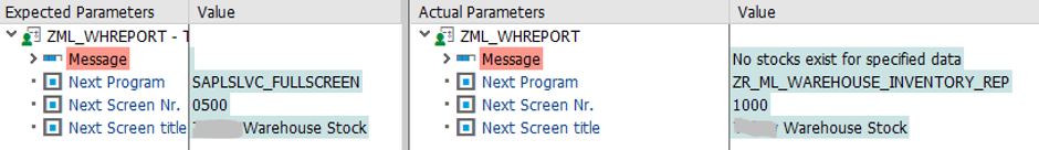 In this case, notice that the screens are different in the expected and actual parameters. In the recording, the user was taken to a list of stock, whereas in the playback the bot remained on the selection screen. This failure, therefore, is not suitable for a step-level suppression.