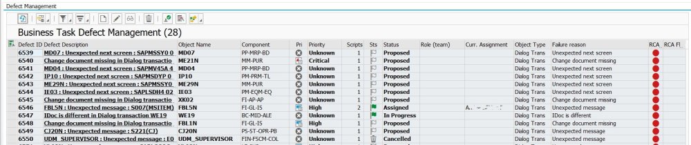 - Defect description: This contains the affected object (transaction code, batch job name, etc.) and a summary of the issue (e.g., “Unexpected message” or “Unexpected next screen”).
