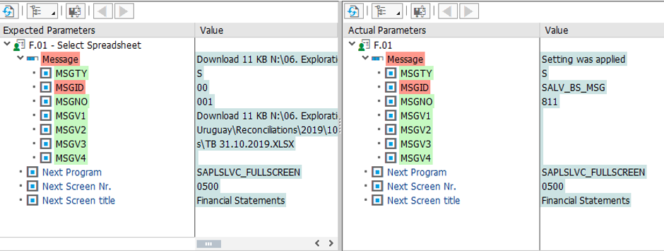 These two sections allow you to compare, side-by-side, the step results from the recording (Expected Parameters) and the playback (Actual Parameters). Differences between the two results sets will be highlighted in red.