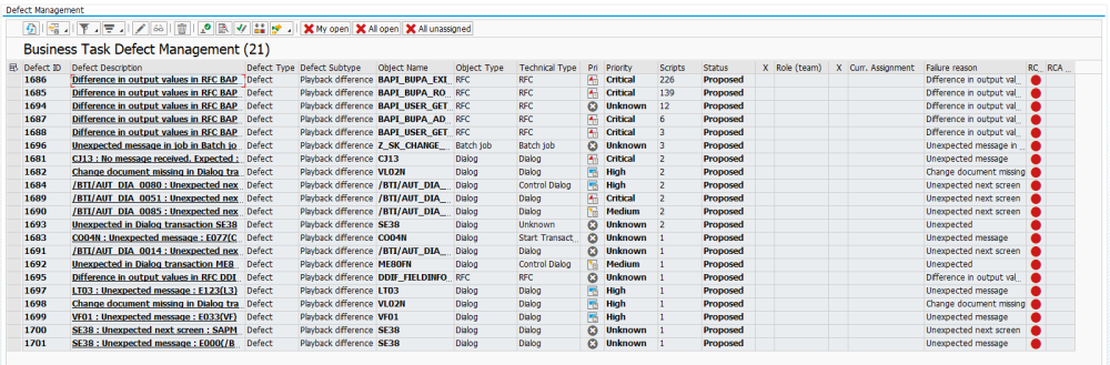 - Defect description: This contains the affected object (transaction code, batch job name, etc.) and a summary of the issue (e.g., “Unexpected message” or “Unexpected next screen”).