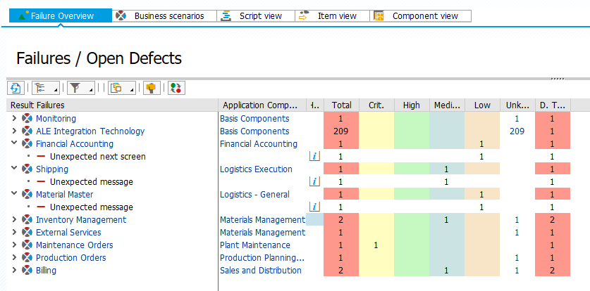 Auf dieser Registerkarte sehen Sie die Fehler aus dem Abspielen gruppiert nach ihrer SAP-Anwendungskomponente und den Prioritäten aus der Abdeckungsanalyse. Wenn Sie den Baum der einzelnen Anwendungskomponenten aufklappen, können Sie die Art und Anzahl der Fehler sehen (z. B. Unerwarteter nächster Bildschirm oder Unerwartete nächste Meldung).