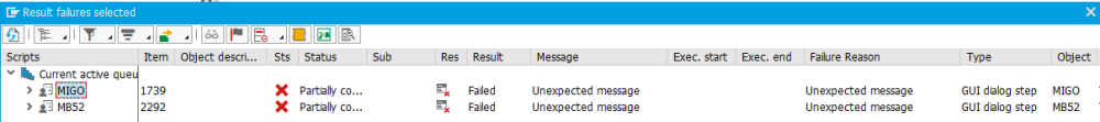 Durch Anklicken der „Zahlen-Hotlinks“ in der Anzeige werden die einzelnen Fehler für diesen Bereich angezeigt. Wenn Sie z. B. auf die Zahl 2 in der Spalte Gesamt für die Bestandsverwaltung klicken, werden Ihnen die beiden einzelnen Fehler angezeigt. In diesem Fall sind dies unerwartete Fehler in den Transaktionen MIGO und MB52.