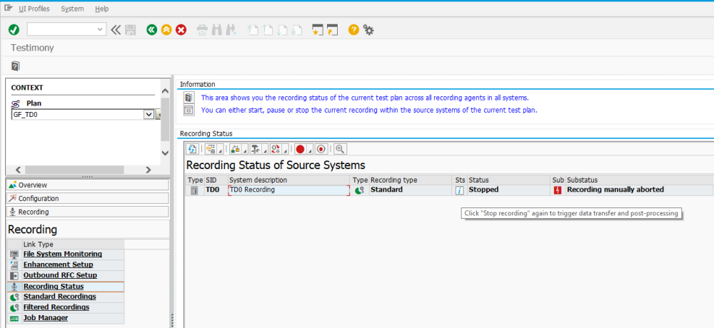 - Testimony kann auch automatisch abbrechen, wenn die Aufzeichnung das Shared Memory auf einem Anwendungsserver vollständig genutzt wurde und mehr als der allgemeine Parameter ALLOWED_DB_WRITES pro Minute (normalerweise auf 1.000 eingestellt) direkt in die DB geschrieben wird.
