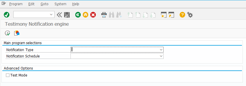 Use SM36 to set up the program /BTI/AUT_NOTIFICATION_ENGINE as a SAP standard batch job. It is recommended that you don’t select any Notifications Types or Notification Schedules so you don’t need a variant, however, it is possible to have more frequent runs for certain selections if you want a more complex setup.