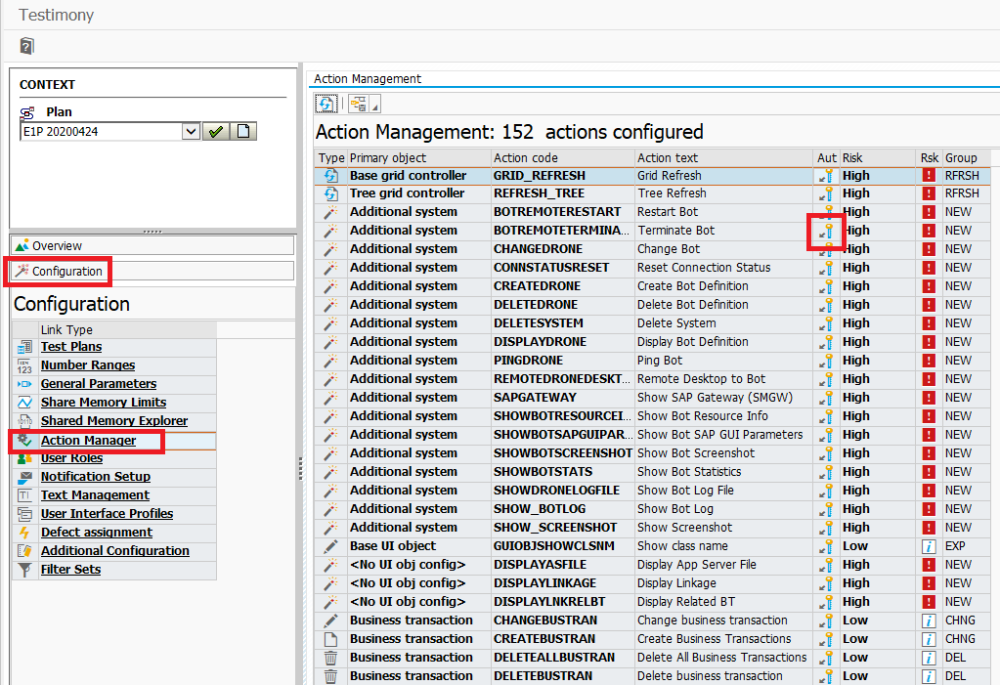 Access for each role to the individual actions/activities within Testimony are assigned within the Action Manager. In Configuration>Action Manager you can see all authorizations within Testimony, information about each action, and assign them to the appropriate roles by clicking in the icon in the “Aut” column.