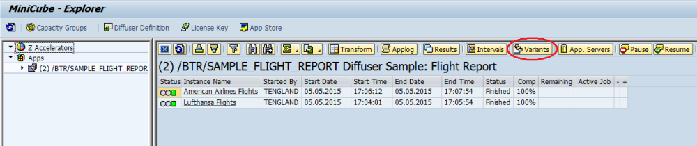 To access the details entered on the selection screen for an instance click the variant button as below.