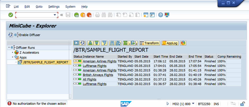 This involves access to the MiniCube transaction /BTR/MINICUBE with Diffuser Mode giving an error message as below.