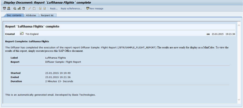 Diffuser provides the functionality to automatically send a notification to users SAP inbox as defined on the Distribution List once the report results are complete. This improves the flow of information by ensuring that results are passed onto the business users at the soonest possible moment. It is no longer necessary to rely on business processes to notify and pass on a reports output to the business, instead a link to the report output is sent automatically to the users inbox. The results can be accessed by this link.