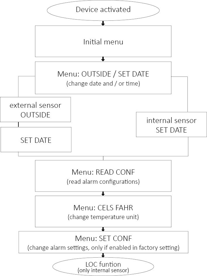 Note: If you scroll through the menu and you reach the LOC function (internal sensor) or the display of the measuring mode (external sensor) again you need to restart from the beginning by accessing the menu. In order to adjust more than one setting (e.g. time & Celsius to Fahrenheit) you must complete each change and return to menu mode for the 2nd change.