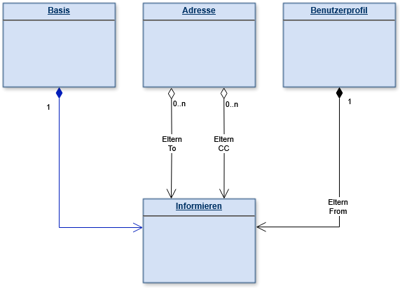 Informieren erweitert wie im Klassenmodell im Abschnitt “Adressen” zu sehen Basis.Vorgang und ist strukturell sehr ähnlich aufgebaut wie die E-Mail. Aber Informieren fällt nicht unter den Begriff Vorgang, da folgende Unterschiede vorhanden sind: