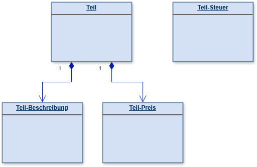 Ein Teil kann Preise und Beschreibungen haben. Die Teile-Steuer ist nicht über eine Relation mit dem Teil verbunden.