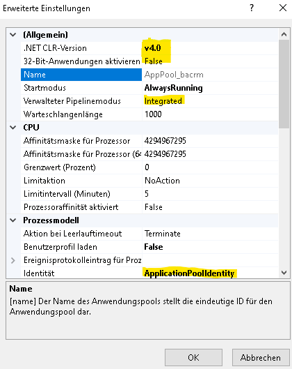 - Im IIS Manager im Bereich Anwendungspools einen neuen Anwendungspool anlegen, wenn der “DefaultAppPool” nicht verwendet werden soll (z.B. BusinessAppPool)