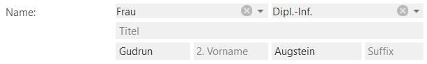 Das Steuerelement beinhaltet alle Felder, um eine Person korrekt zu erfassen (z.B. Vorname, Titel, Anrede). Sie werden gleichzeitig und optimiert dargestellt in der Maske angezeigt.