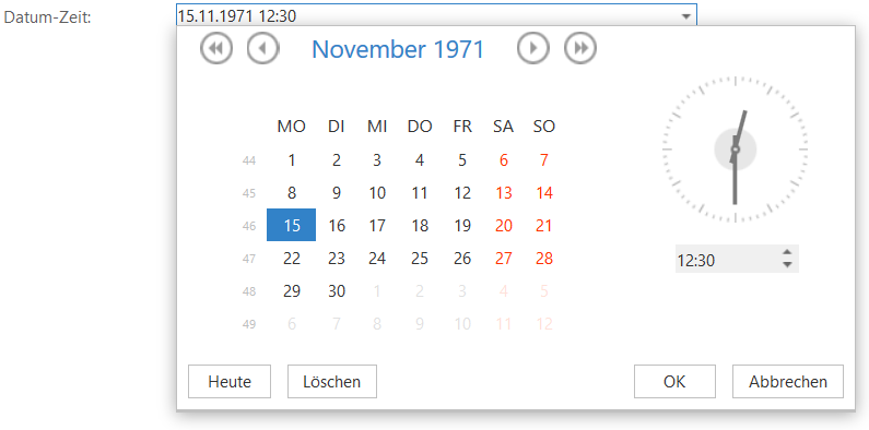 Dieses Steuerelement erlaubt die Auswahl eines Datums und eines Zeitpunkts.