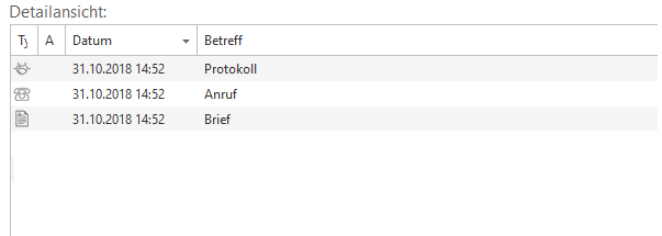 Dieses Steuerelement zeigt eine Ansicht innerhalb einer Maske an. In der Ansicht können Datensätze mehrerer Datentabellen (zum Beispiel Anrufe, Briefe, E-Mails) angezeigt werden, welche zu dem aktuell in der Maske angezeigten Datensatz in Relation stehen.