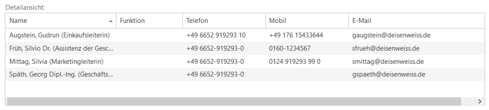 Dieses Steuerelement zeigt eine Ansicht innerhalb einer Maske an. In der Ansicht werden nur Datensätze genau einer Datentabelle (bsp. Kontakte) angezeigt, welche zu dem aktuell in der Maske angezeigten Datensatz in Relation stehen. Optional können neue Datensätze in dieser Datentabelle angelegt werden.
