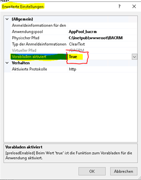 Damit wird dem IIS mitgeteilt, dass der Anwendungspool immer laufen soll.