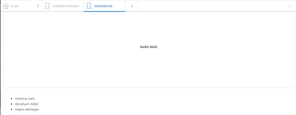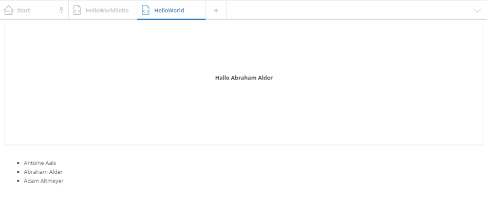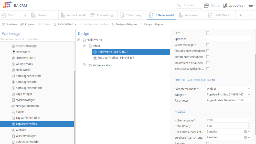 Nun kann das Widget in einer Seite konfiguriert werden. Als Beispiel wird es mit einem HelloWorldWidget konfiguriert, das von TopUserProfilesWidget den Parameter liest.