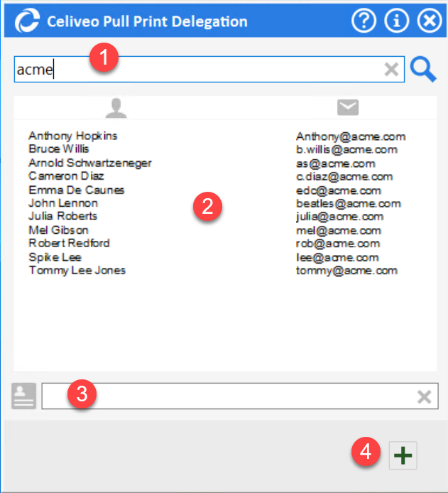 In a few clicks, a user can delegate Pull Print to another Active Directory User chosen within a list accessible from a button in the Windows Taskbar.