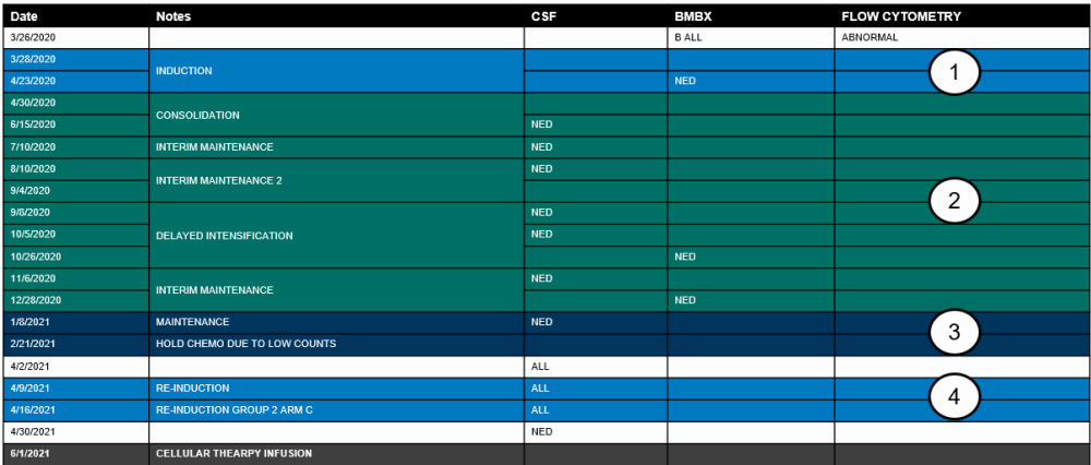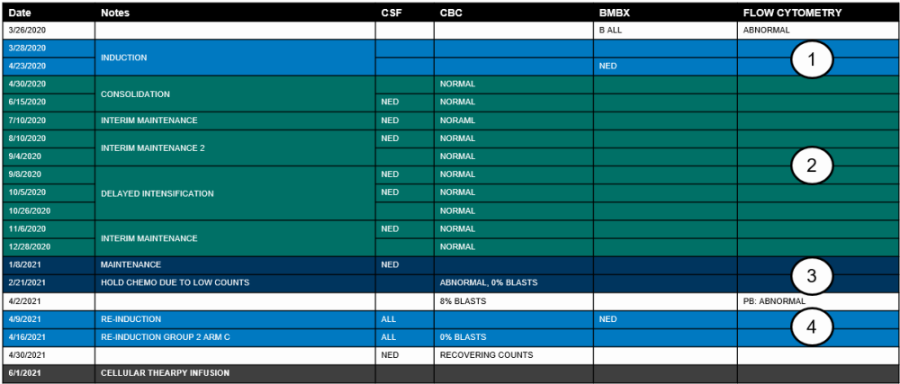 Example 2: Similar to example 1 , a recipient with ALL is diagnosed in March 2020 and receives a cellular therapy in June 2021. The recipient was on a COG protocol and received multiple therapies but with limited disease assessments. The disease tracker for this recipient is below: