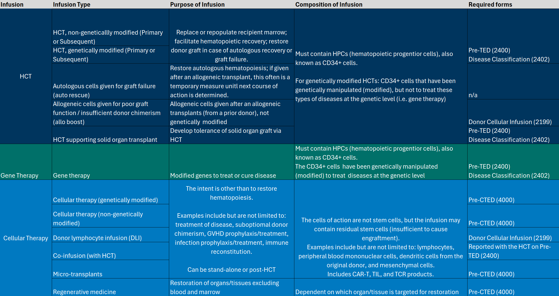 This appendix includes definitions of Hematopoietic Cell Transplant (HCT) (including primary and subsequent, autologous cells given for graft failure, allogeneic cells given for poor graft function / insufficient donor chimerism, and HCT supporting solid organ transplant), gene therapies, cellular therapies (alone or post-HCT, co-infusion, DLI and micro-transplant). For more information see Table 1.