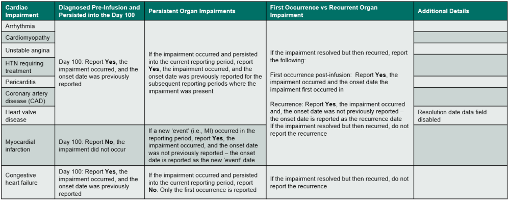 | Q307 | 4/19/2025 | Add | Instructions clarified when to report Yes or No for coronary artery disease: _Indicate if the recipient experienced a cardiac impairment or disorder. Review the list below to determine if the condition should be reported as cardiac impairment / disorder. Refer to Table 5. Cardiac Impairments for an overview of when to report the impairment. If Yes, report the onset date, specify if the impairment / disorder, and answer any other applicable questions. If the cardiac impairment or disorder is an arrhythmia, cardiomyopathy, unstable angina, hypertension requiring treatment, pericarditis, coronary artery disease (CAD), or heart valve disease, use the following guidelines to determine when to report Yes or No: | Missed cardiac organ impairment from original instructions |
