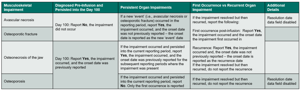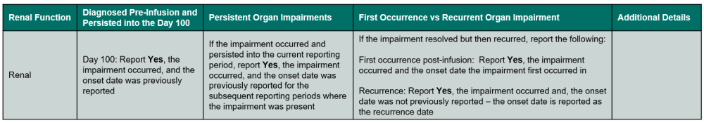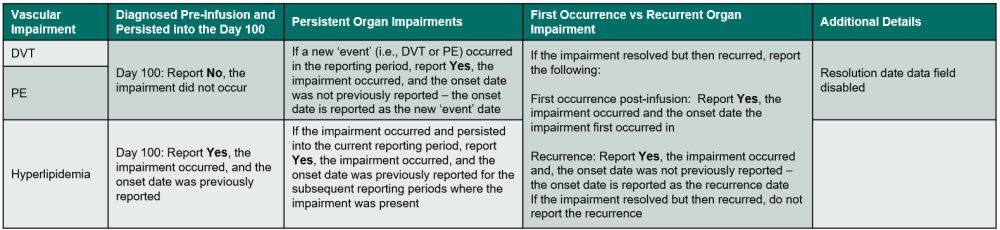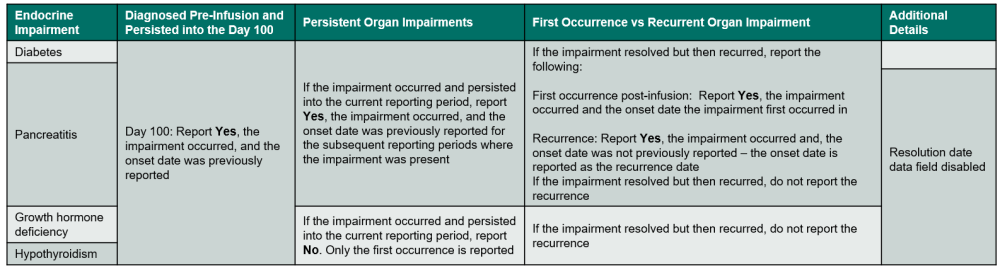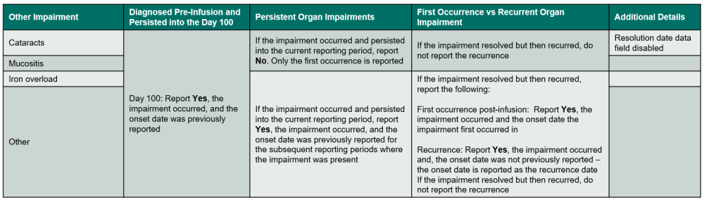 - The impairment was diagnosed and resolved prior to infusion or in a previous reporting period and the impairment recurred post-infusion.