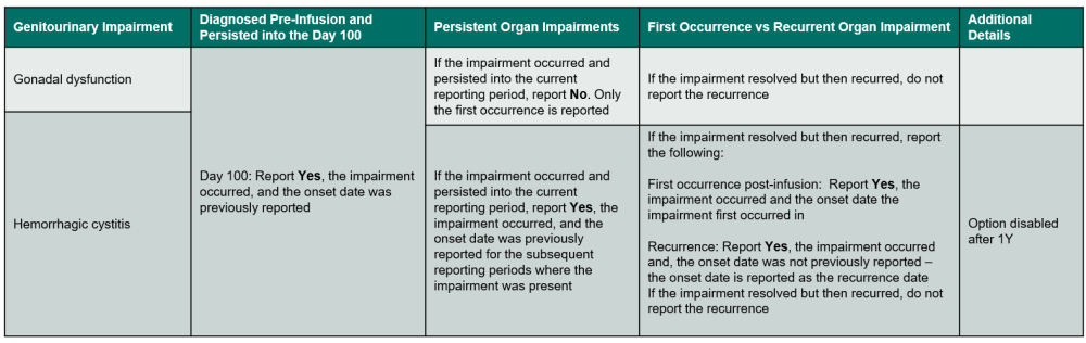 If the genitourinary impairment / disorder is hemorrhagic cystitis, use the following guidelines to determine when to report Yes or No: