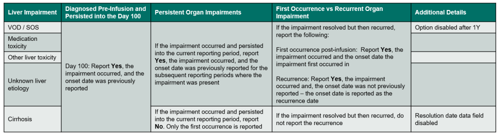 Indicate if a non-infectious liver toxicity occurred during the reporting period. Include toxicities which developed between the start of the preparative regimen and the date of last contact (question 1) when completing the 100-day follow-up form. Refer to Table 2. Liver Impairments for an overview of when to report the impairment. Do not report liver complications due to GVHD in this section.