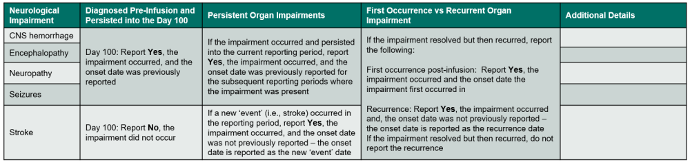 - The impairment was diagnosed prior to infusion and persisted into the Day 100 reporting period.