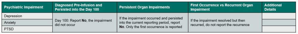Indicate if the recipient experienced a psychiatric impairment or disorder, requiring medication. Review the list below to determine if the condition should be reported as neurological impairment / disorder. Refer to Table 11. Psychiatric Impairment for an overview of when to report the impairment. If Yes, report the onset date, specify if the impairment / disorder, and answer any other applicable questions.