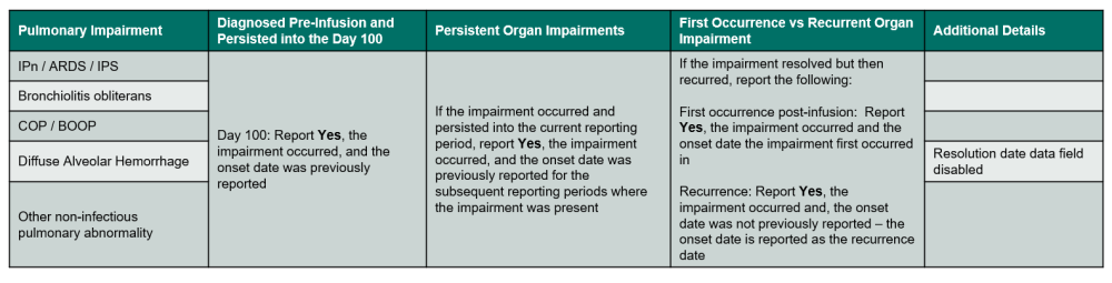 Indicate if any other non-infectious pulmonary abnormality (listed below) occurred in the current reporting period. If the impairment occurred, report the diagnosis date and the diagnostic method(s), other than radiographic studies. Select all that apply. Refer to Table 1. Pulmonary Impairments for an overview of when to report the impairment.