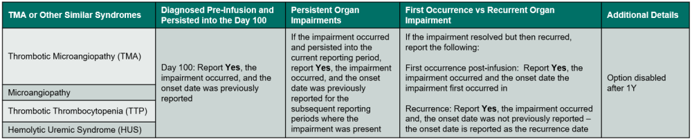 Indicate if TMA or a similar syndrome occurred in the current reporting period. Refer to Table 3. TMA or Other Similar Syndromes for an overview of when to report the impairment.