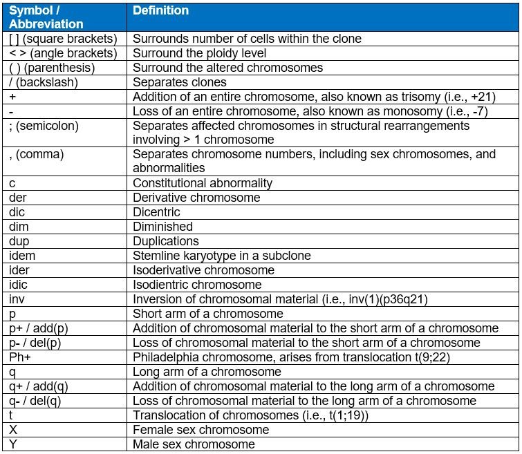 Chromosomal abnormalities refer to changes in the amount or location of chromosomal material. A basic knowledge of chromosome symbols / abbreviations is required to interpret karyotype test results. Definitions of general categories of chromosomal abnormalities are provided below. Definitions of common cytogenetic symbols / abbreviations are provided in Table 1.