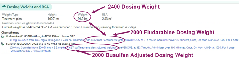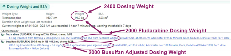 - Example 1: The recipient’s preparative regimen consisted of fludarabine and busulfan. The dosing weight to calculate the preparative regimen drug doses was 91.9 kg which was the same weight used for dosing weight of fludarabine. However, the dosing weight for busulfan was adjusted to 62.7 kg.