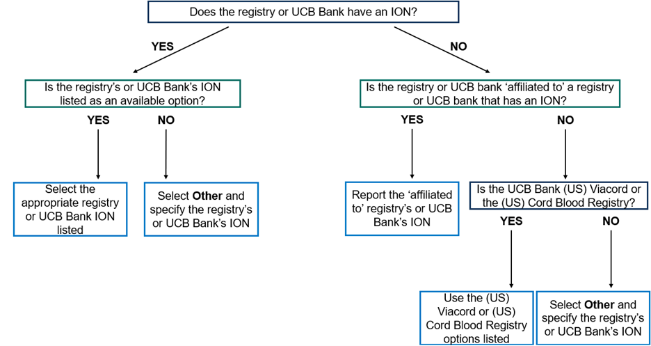 Specify the registry or umbilical cord blood (UCB) bank used to obtain the adult donor or umbilical cord blood unit. If Other Registry is selected, specify the four-digit ION or affiliated ION. If the registry or UCB bank does not have ION or affiliated ION, report the organization’s official name.