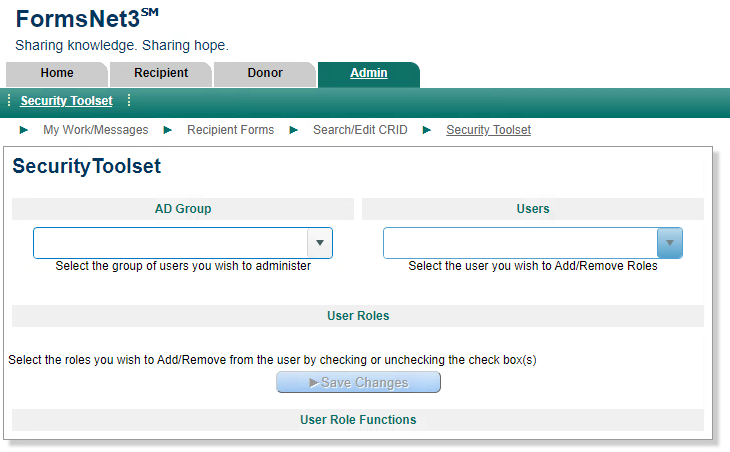 The Security Toolset is only accessible by the center’s Primary Data Manager or Primary Coordinator. There can only be one assigned CIBMTR Primary Data Manager per center. This screen is used to assign or remove security roles for staff that use FormsNet3. The LDAP Group dropdown lists all the LDAP groups for the logged in Primary Data Manager.