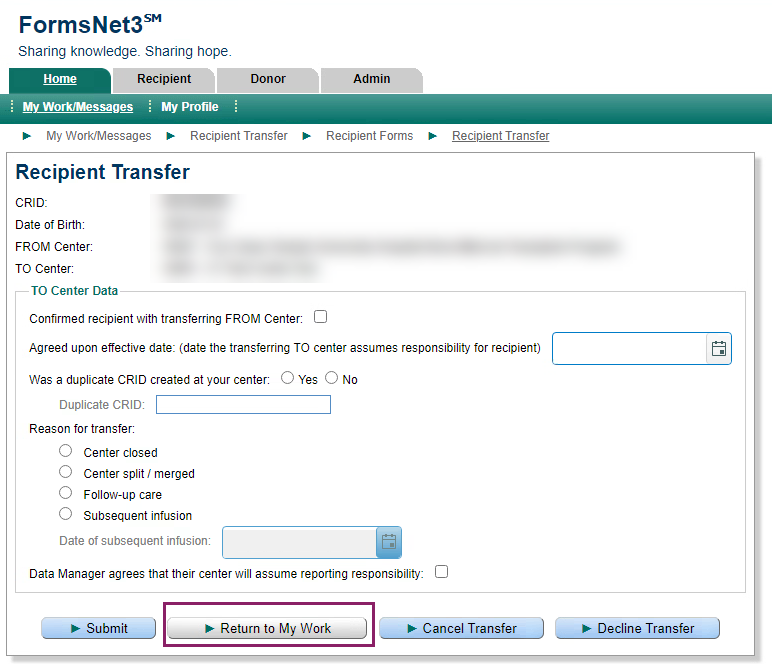 If the user has opened the transfer request and is not ready to complete the questions, select the ‘Return to My Work’ button. If any data has been entered and the ‘Return to My Work’ button is selected, the data will not be saved.