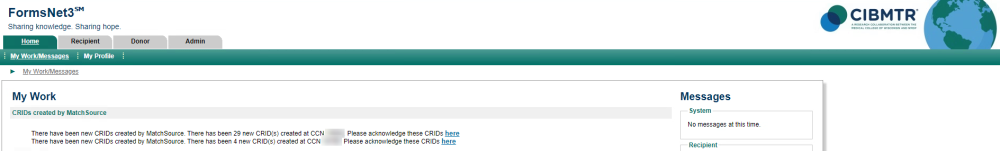 When CRIDs are created through the Upstream process, FN3 will display a notification on the My Work landing page with an acknowledgement link that will take user to the Search/Edit CRID page